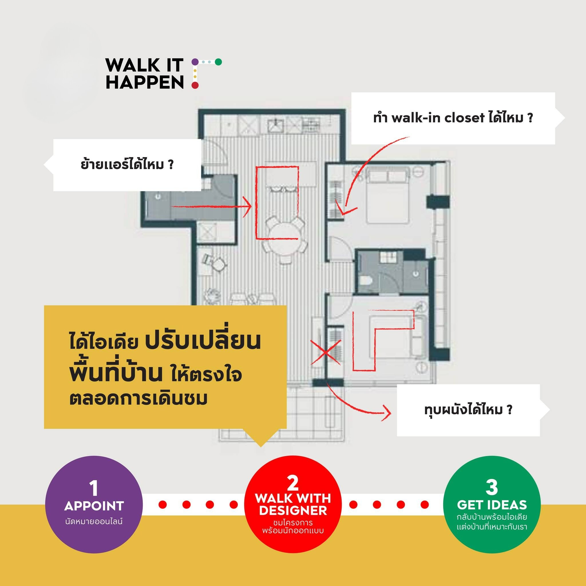 ใครเคยเจอปัญหานี้บ้าง? เวลาไปดูบ้านตัวอย่างที่ถูกใจ ไม่ว่าจะเป็นบ้าน ทาวน์โฮม หรือแม้กระทั่งคอนโด ที่ห้องตัวอย่างก็สวยมากเลยนะ แต่แต่งตามไม่ได้ทั้งหมด ไหนงบจะจำกัดอีก หรือบางทีก็ตกแต่งภายในบ้านได้สวยมาก ๆ แต่ไม่ตอบโจทย์ไลฟ์สไตล์และการใช้งานจริงเลย หลายครั้งพอได้ไปดูห้องเปล่าโล่ง ๆ แล้วต้องคิดเองใหม่ทั้งหมดก็คงใช้เวลานานเกินไป ถ้ามีบริการสุดเอ็กซ์คูลซีฟอย่าง AP Walk It Happen ที่จะพาทุกคนไปเดินดูบ้านตัวอย่าง พร้อมออกแบบบ้านให้เห็นกันก่อน ก็คงจะช่วยแก้ไขปัญหานี้ให้หมดไป