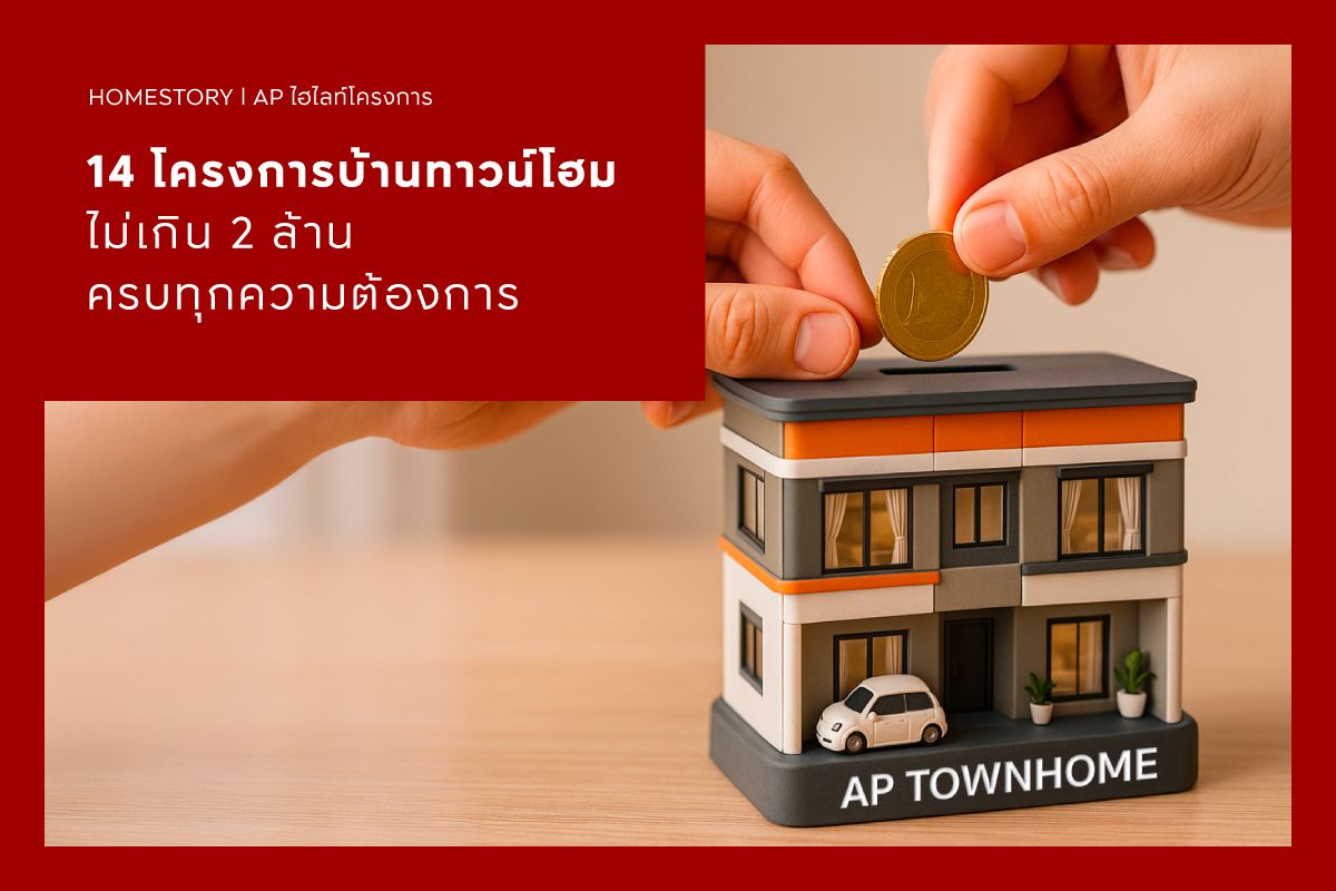 สำหรับใครที่ต้องการบ้านราคาคุ้มค่า ต้องโครงการทาวน์โฮมราคาไม่เกิน 2 ล้าน ด้วยราคาที่จับต้องได้ พร้อมตอบโจทย์ความต้องการอย่างครอบคลุม ทั้งฟังก์ชันการใช้งาน สิ่งอำนวยความสะดวก ทำเลที่ตั้ง และการเดินทาง วันนี้ AP Thai เลยจะพาทุกคนไปรู้จักกับ 14 โครงการทาวน์โฮมไม่เกิน 2 ล้าน ที่ครบจบทุกไลฟ์สไตล์ แถมยังเหมาะกับการเริ่มต้นครอบครัวอีกด้วย ซึ่งจะมีโครงการไหนบ้างนั้น ตามไปดูกันเลย