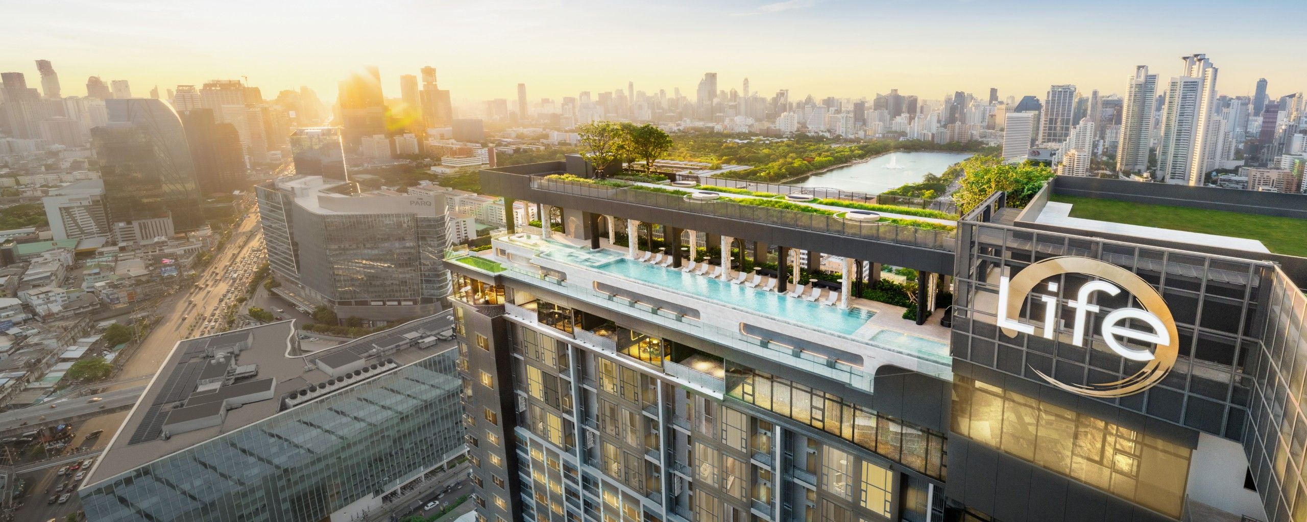 LIFE พระราม 4-อโศก โครงการคอนโด High Rise 39 ชั้น ที่มอบพื้นที่ชีวิตขนาด 75 ตร.ม. บนทำเลพรีเมียม เชื่อมต่อย่าน CBD อโศก-สาทร-สีลม ใกล้ทางพิเศษเฉลิมมหานคร เพียง 15 นาที* ลงตัวกับการออกแบบพื้นที่ส่วนกลาง Quintuple Facility 5 ชั้น รองรับทุกกิจกรรม ทั้งการพักผ่อนและทำงาน เปิดรับทัศนียภาพที่สวยงามรอบด้านถึง 3 มุมมอง ทั้งสวนเบญจกิติ 800 ไร่ โค้งน้ำบางกระเจ้า และวิวใจกลางเมืองสุขุมวิท-อโศก