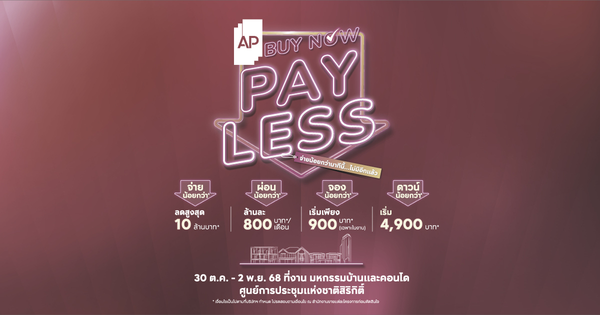 - AP BUY NOW, PAY LESS จากเอพี บริษัทอสังหาฯ ที่เข้าใจทุกความต้องการและความรู้สึกอย่างลึกซึ้ง ไม่ใช่แค่การมองดีลที่คุ้มค่าที่สุด แต่คือการยกระดับ Living Quality ที่ออกแบบมาเพื่อคุณโดยเฉพาะ ให้คุณ “จ่ายน้อยลง” แต่ได้พื้นที่ชีวิตที่เหนือกว่าในทุกตารางนิ้ว!