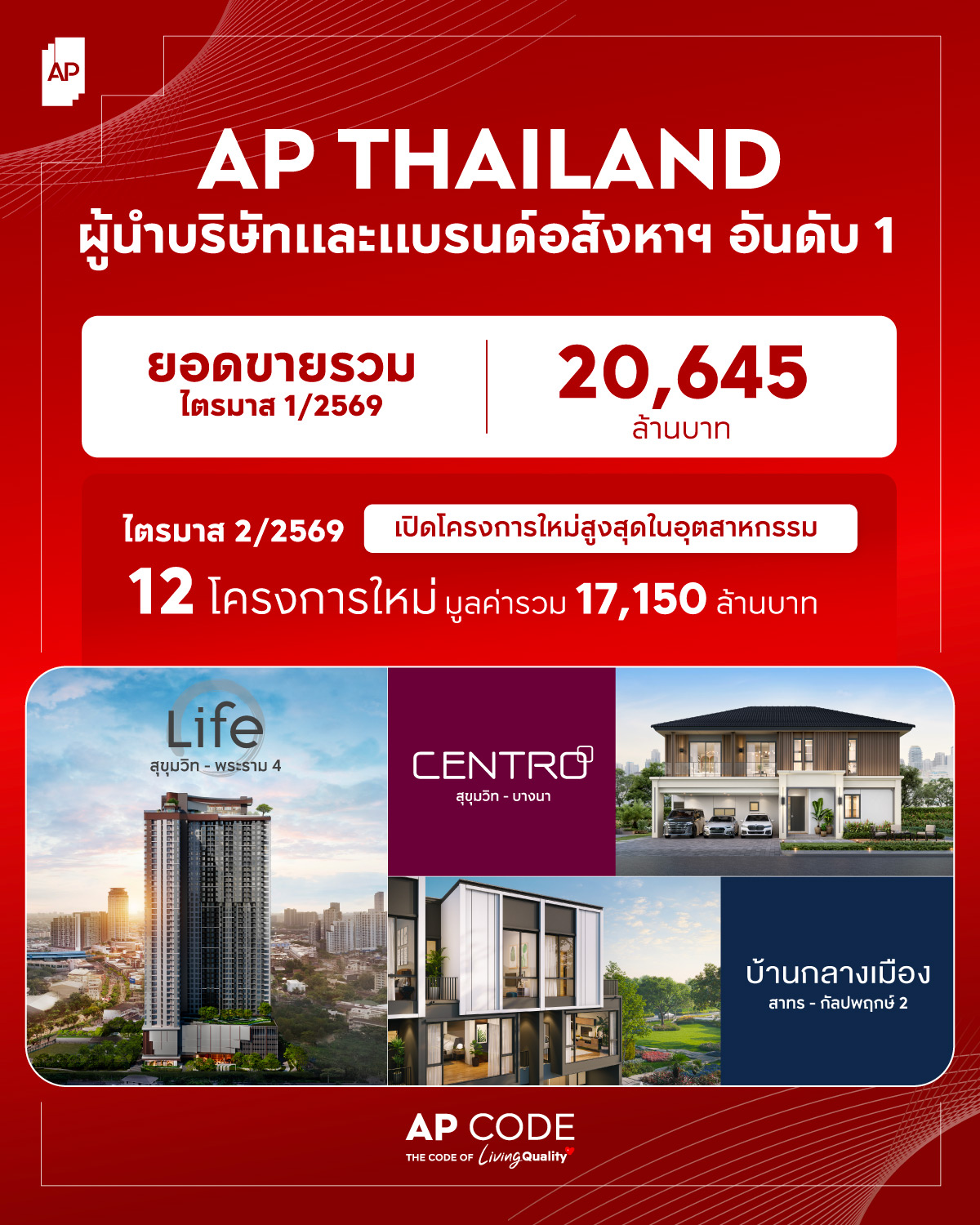 - เอพี ไทยแลนด์ ภายใต้คำมั่นสัญญา ชีวิตดีๆ ที่เลือกเองได้ ครองความเป็นผู้นำธุรกิจพัฒนาอสังหาริมทรัพย์เพื่อการอยู่อาศัย บริษัทและแบรนด์อันดับหนึ่งที่ลูกค้าเชื่อมั่น โชว์ฟอร์มแกร่งไตรมาส 1 ด้วยยอดขายทะลุกว่า 20,645 ล้านบาท สะท้อนดีมานด์จริง และความไว้วางใจจากลูกค้า ควบคู่เสถียรภาพทางการเงินที่มั่นคง