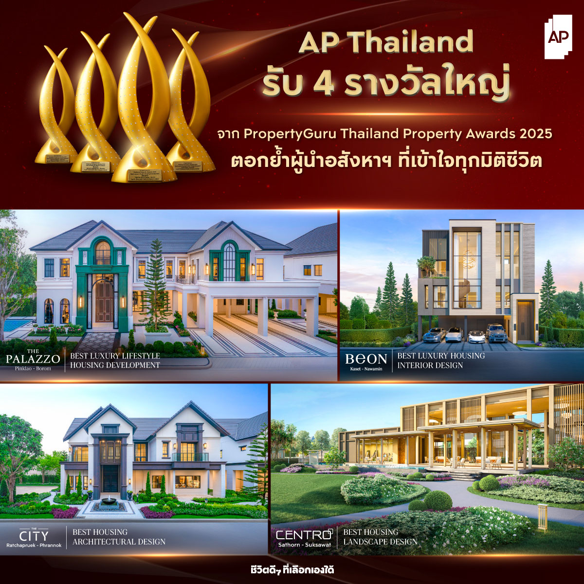 - เอพี ไทยแลนด์ ประกาศความสำเร็จต่อเนื่องกลุ่มธุรกิจบ้านเดี่ยวเอพีรับ 4 รางวัลใหญ่จากเวที PropertyGuru Thailand Property Awards 2025 ย้ำวิสัยทัศน์และพันธกิจในการเป็นผู้นำด้านอสังหาริมทรัพย์ที่เข้าใจทุกมิติชีวิต เพื่อส่งมอบ ‘ที่สุดของ Living Quality ในแบบคุณ’ ให้ทุกคนได้มี ‘ชีวิตดีๆ ที่เลือกเองได้’