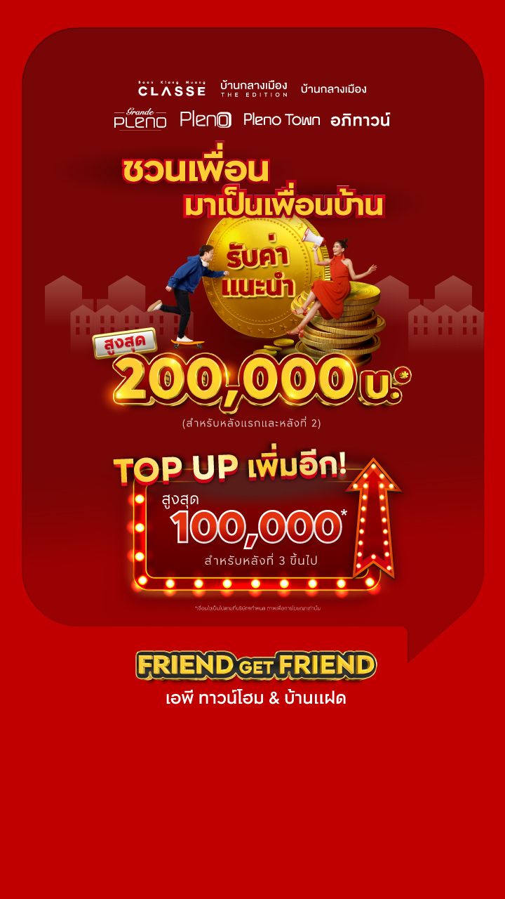 5. เมื่อเพื่อนจองและโอนกรรมสิทธิ์ 3 หลังเป็นต้นไป เราได้รับ Top Up เพิ่มอีกสูงสุด 100,000 บาท*/หลัง✨